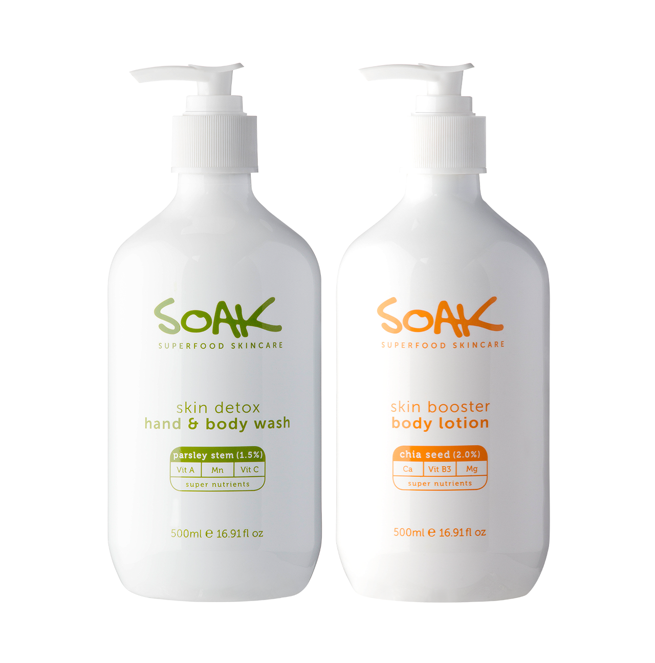 Refresh and nourish your skin with the Power Body Duo, a perfect pairing of our Skin Detox Hand & Body Wash and Skin Booster Body Lotion. Infused with superfoods like Parsley Stem and Chia Seeds, this duo works together to purify, hydrate, and protect your skin for a naturally radiant glow.